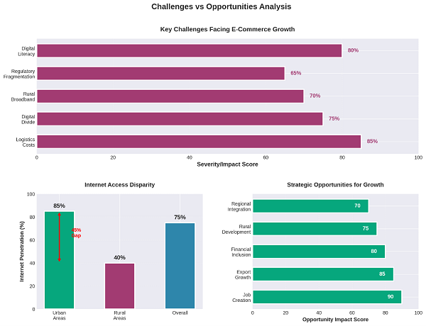 Возможности: Создание рабочих мест (например, 100 000 для женщин с помощью платформ); экспорт; устойчивое развитие (пилотные проекты в области зеленой логистики). Программа Всемирного банка E-GATE способствовала внутрирегиональной торговле на сумму 23 миллиона долларов США в 2024 году.
