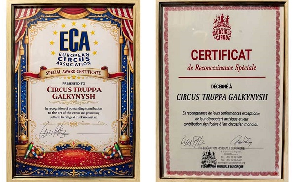 Во время торжественной церемонии, прошедшей в программе фестиваля, представителям туркменской делегации были вручены международные сертификаты от Всемирной федерации цирка (World Circus Federation) и Европейской цирковой ассоциации. Награды присуждены за значительный вклад Группы национальных конных игр «Galkynyş» в развитие и популяризацию циркового искусства.