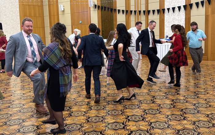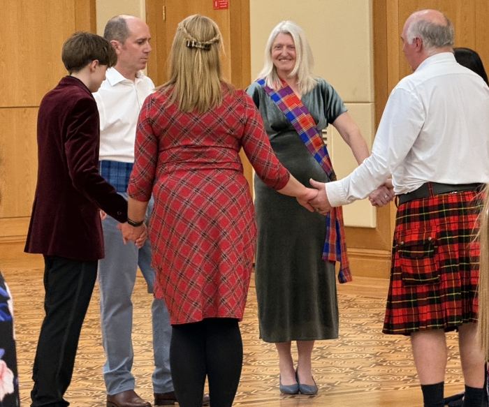 The musical atmosphere was set by Ghillie Dhu, one of Scotland’s premier folk bands based in Edinburgh. Thanks to their step-by-step guidance through seemingly complex moves, every guest was able to take to the floor and join the festivities—it was a vibrant whirlwind of people, laughter, emotion, and the swirling patterns of traditional Scottish tartan.