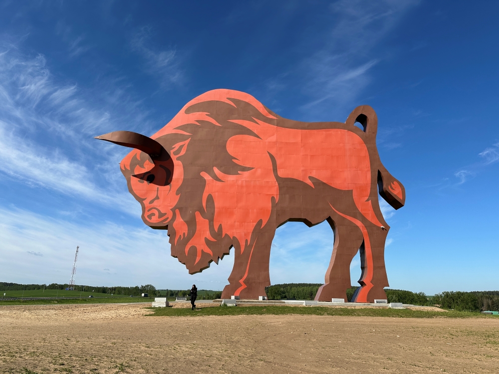 Первым делом на пути из столицы к западным границам вас встречает знаменитая инсталляция зубра — огромная 30-метровая фигура на трассе М1, невольно ассоциирующаяся с неофициальным стражем главной дороги страны.