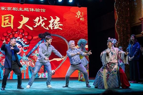 Foreign visitors learn Peking Opera hand gestures from an actor in an interactive experience hall in Qianmen, Beijing, March 22, 2026. [Photo: VCG]